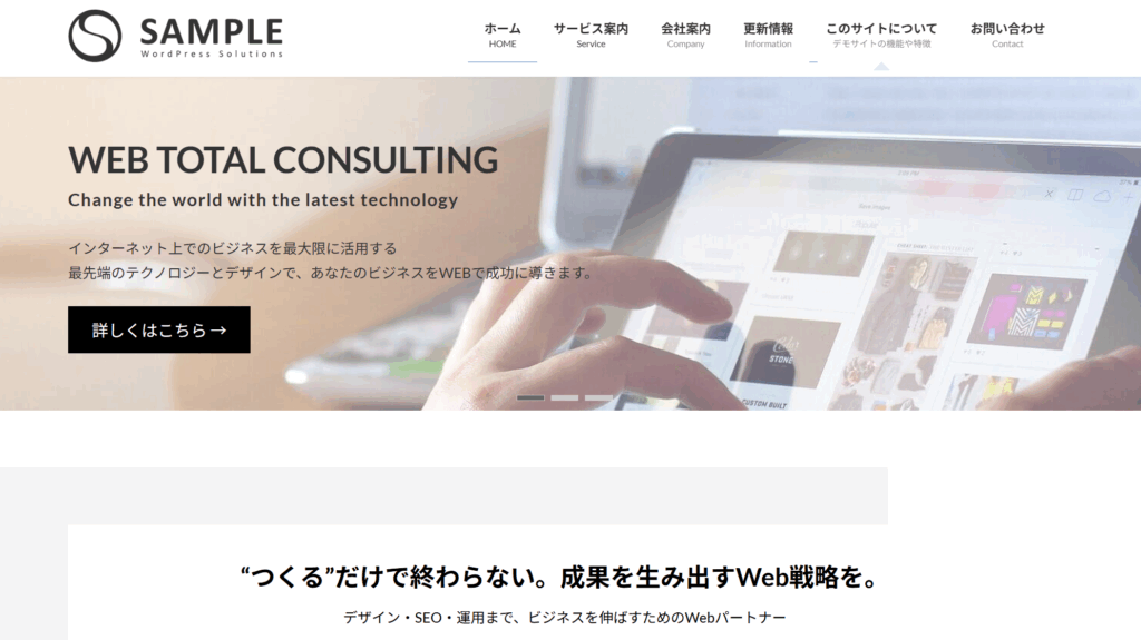 当サービスでは、日本のビジネスサイト向けに開発され、国内で絶大な人気を誇るWordPressテーマ「Lightning」を標準仕様としてサイトを構築します。