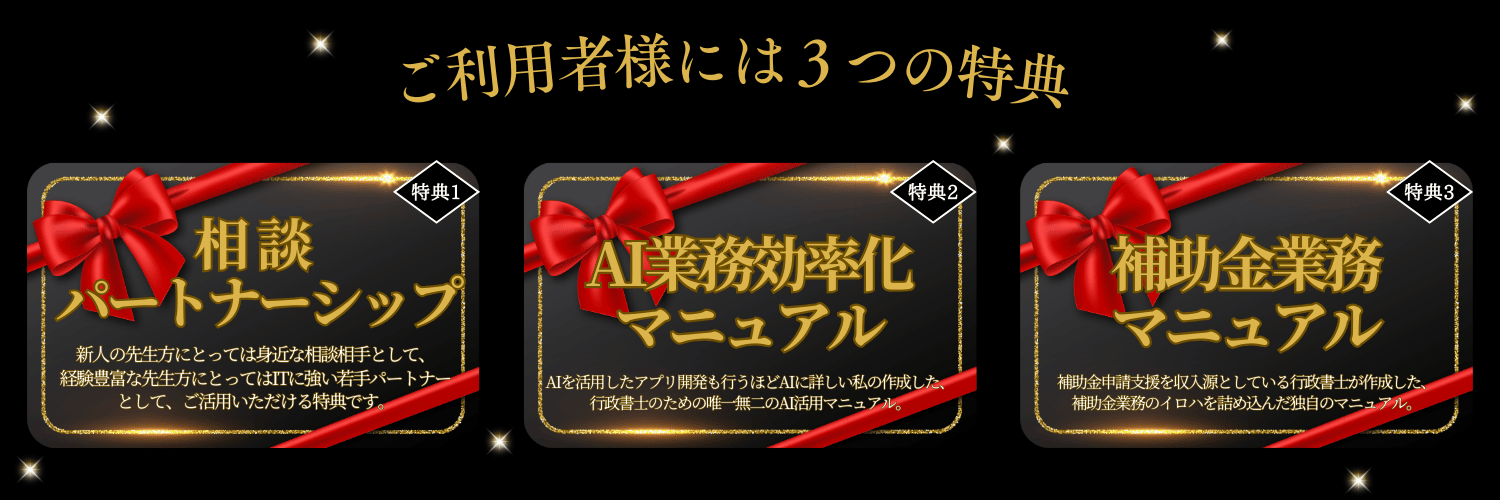 当サービスをご利用いただいたお客様には、ホームページという「武器」をお渡しするだけでは終わりません。行政書士業務を後押しし、その後の事業成長までを見据えた、私、青島ならではの特別な3つの特典をもれなくご提供します。